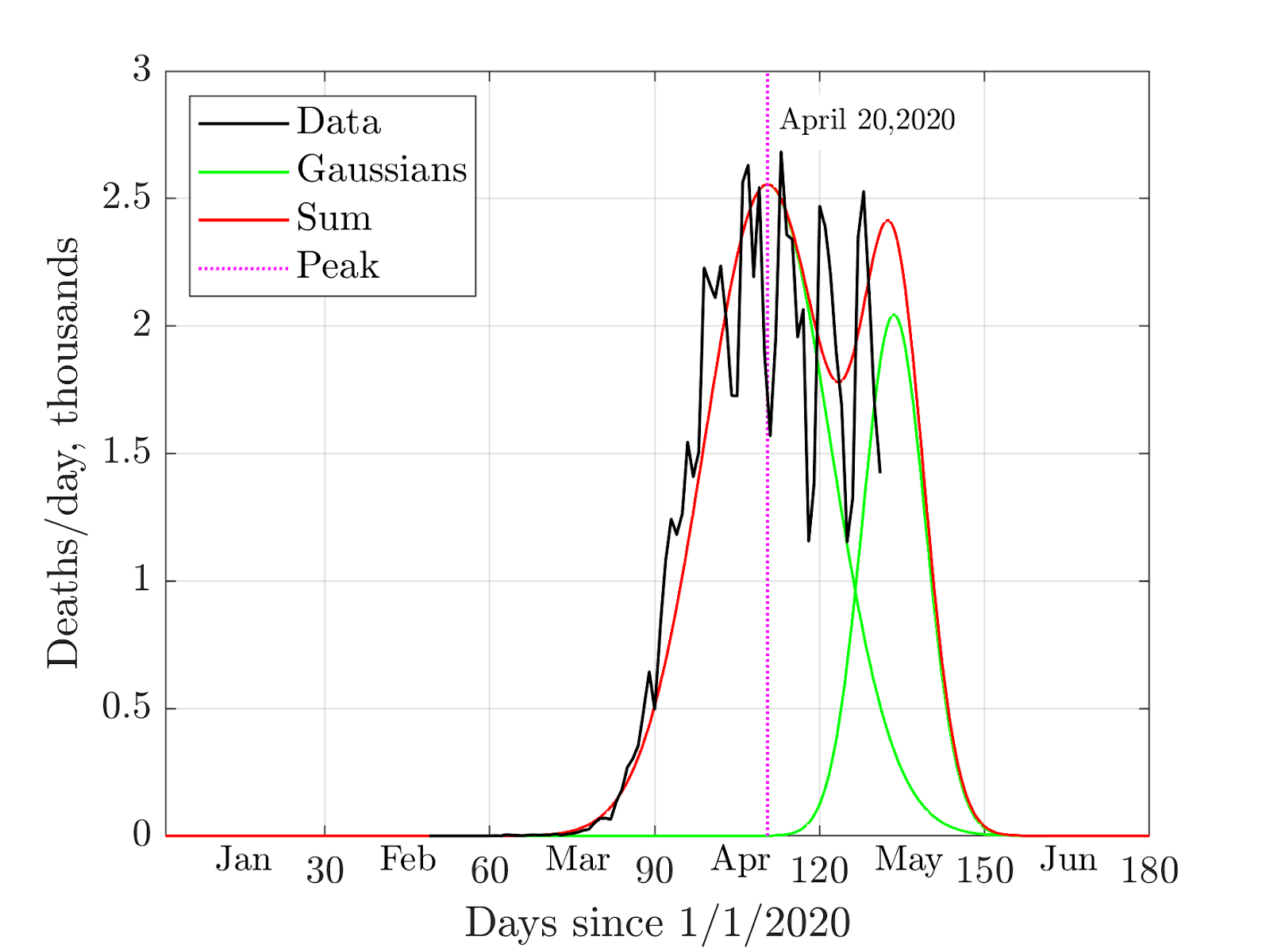 | Figure 7. The US and 4 times the German death rate Gaussians to scale out the population sizes. Source: Patzek's calculations based on the Worldometers data of May 9, 2020, 24:00 GMT. |